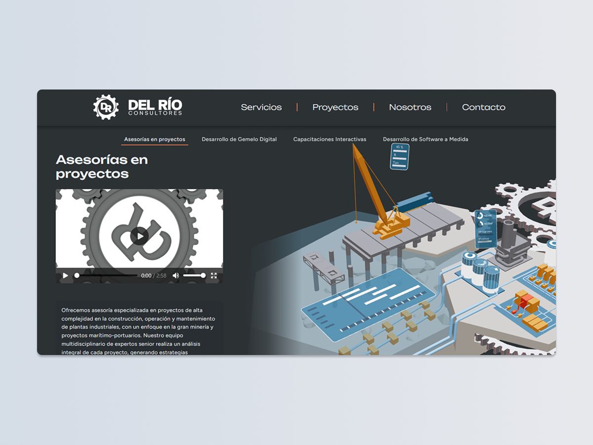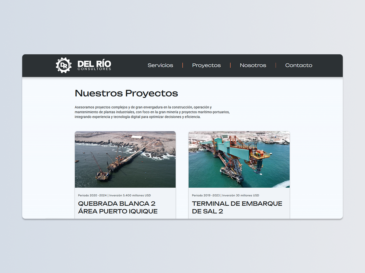 Del Rio es una consutlora con una extensa reputación y años de experiencia en el mercado, que se encuentra atravesando una importante etapa de modernización tecnológica. Para comunicar eficazmente esta evolución, se desarrolló una plataforma web que actúa como punto de encuentro entre su legado histórico y su nueva visión de futuro. El sitio web tiene como objetivo principal tangibilizar este cambio, presentando la robustez y el expertise de años de servicio a través de una interfaz moderna, ágil y digital, demostrando así su capacidad de adaptación y vigencia en el entorno actual.
